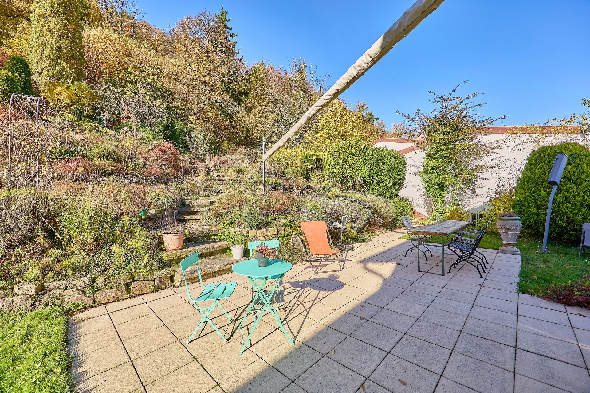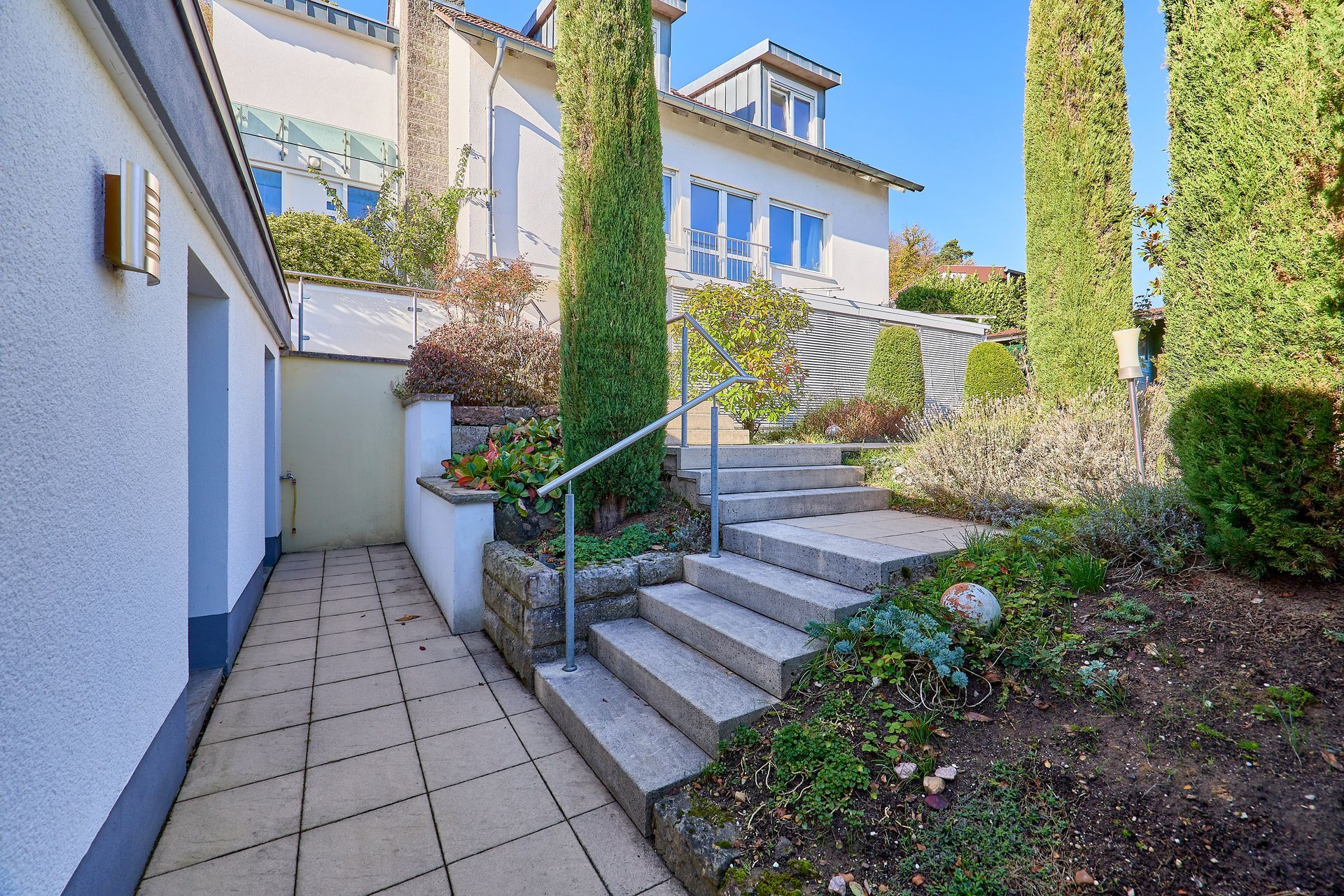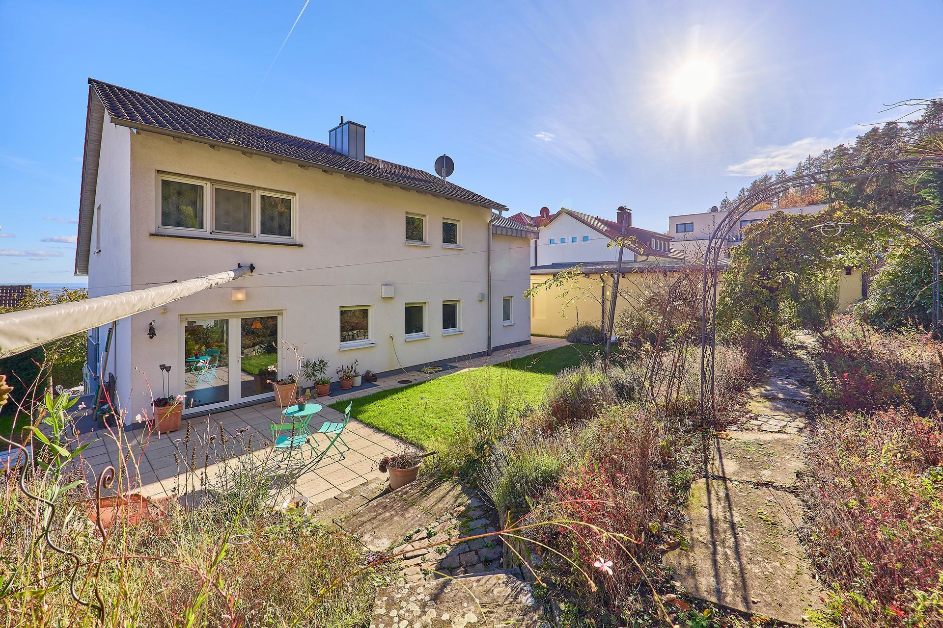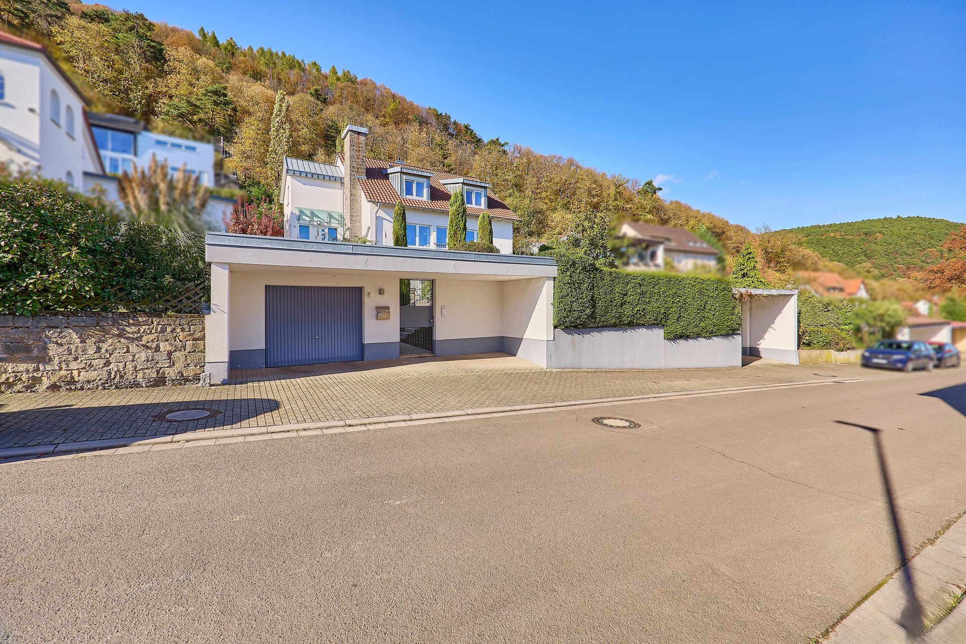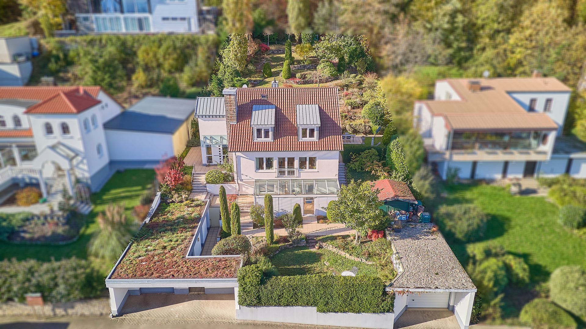 Der schön angelegte Garten mit Terrassenbereichen lädt zur Erholung ein, während eine klimatisierte Wohnmobilgarage und eine PKW-Garage zusätzlichen Komfort bieten. Dieses Haus vereint Wohnkomfort, Lage und Ausblick auf einzigartige Weise und schafft ein ideales Zuhause für alle, die Wert auf Qualität, Licht und ein besonderes Wohnambiente legen.